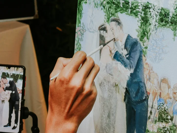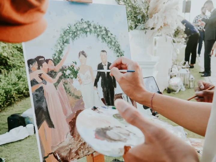 Captivating live artistry breathes life into the canvas, transcending time through dynamic strokes and vibrant hues for brides and grooms.
